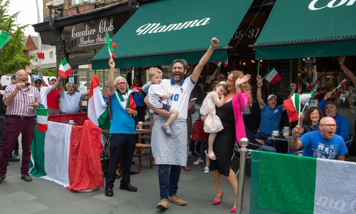 Fans in England’s little Italy waving two flags for Euro 2020 final